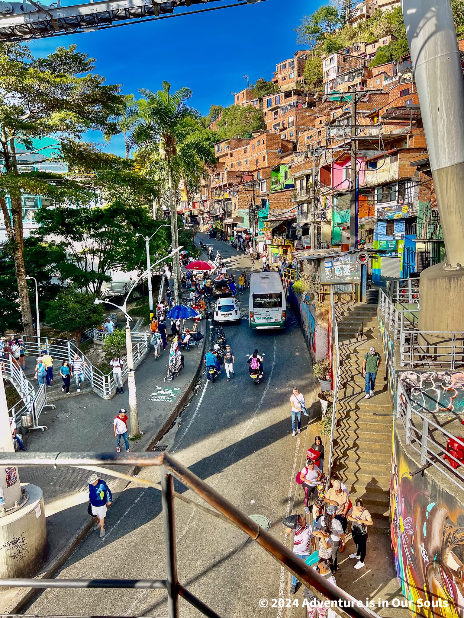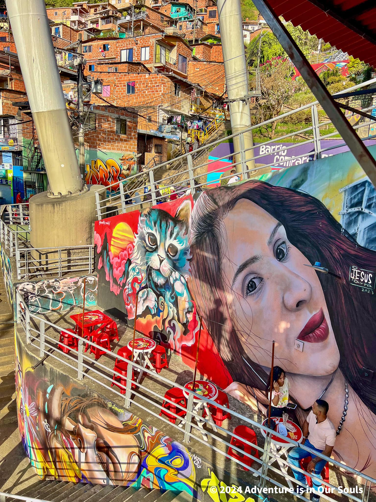 The highlight of the day was Comuna 13. Once one of Medellín’s most dangerous neighborhoods, it has been transformed into a hub of street art, music, and storytelling. We rode the outdoor escalators up the hillside and admired the powerful murals. Local artists shared their stories, and dancers performed in the streets. The area pulsed with creativity and resilience.