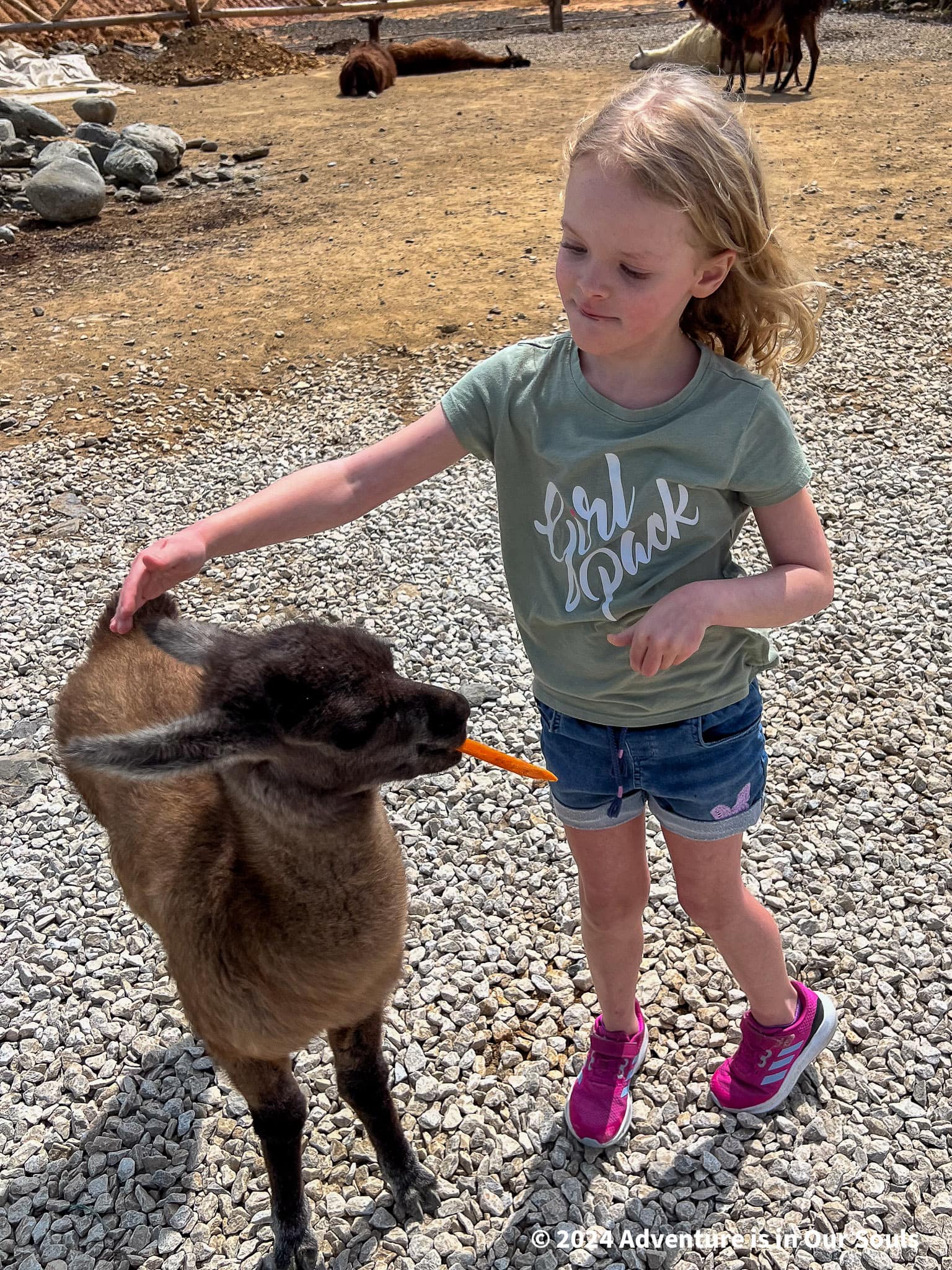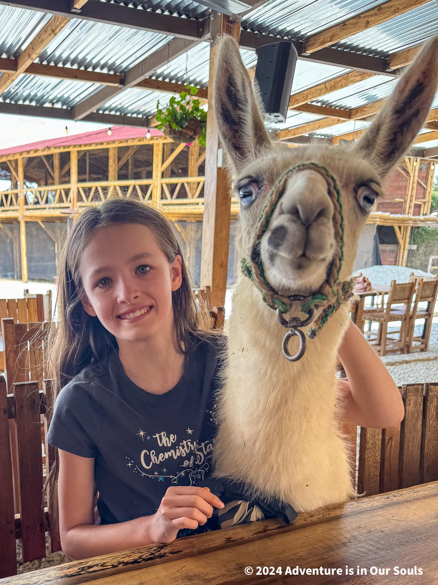 By afternoon, it was time to head toward Guatapé. The drive northeast took a few hours, winding through green hills and mountain scenery that left us speechless. On the way, our driver suggested stopping at El Alto del Chocho for lunch. What a hidden gem! The girls squealed with delight when they saw llamas and goats waiting to be fed at the restaurant entrance. Buckets of carrots in hand, they darted between animals, giggling with joy. Buttercup declared this her favorite stop so far.