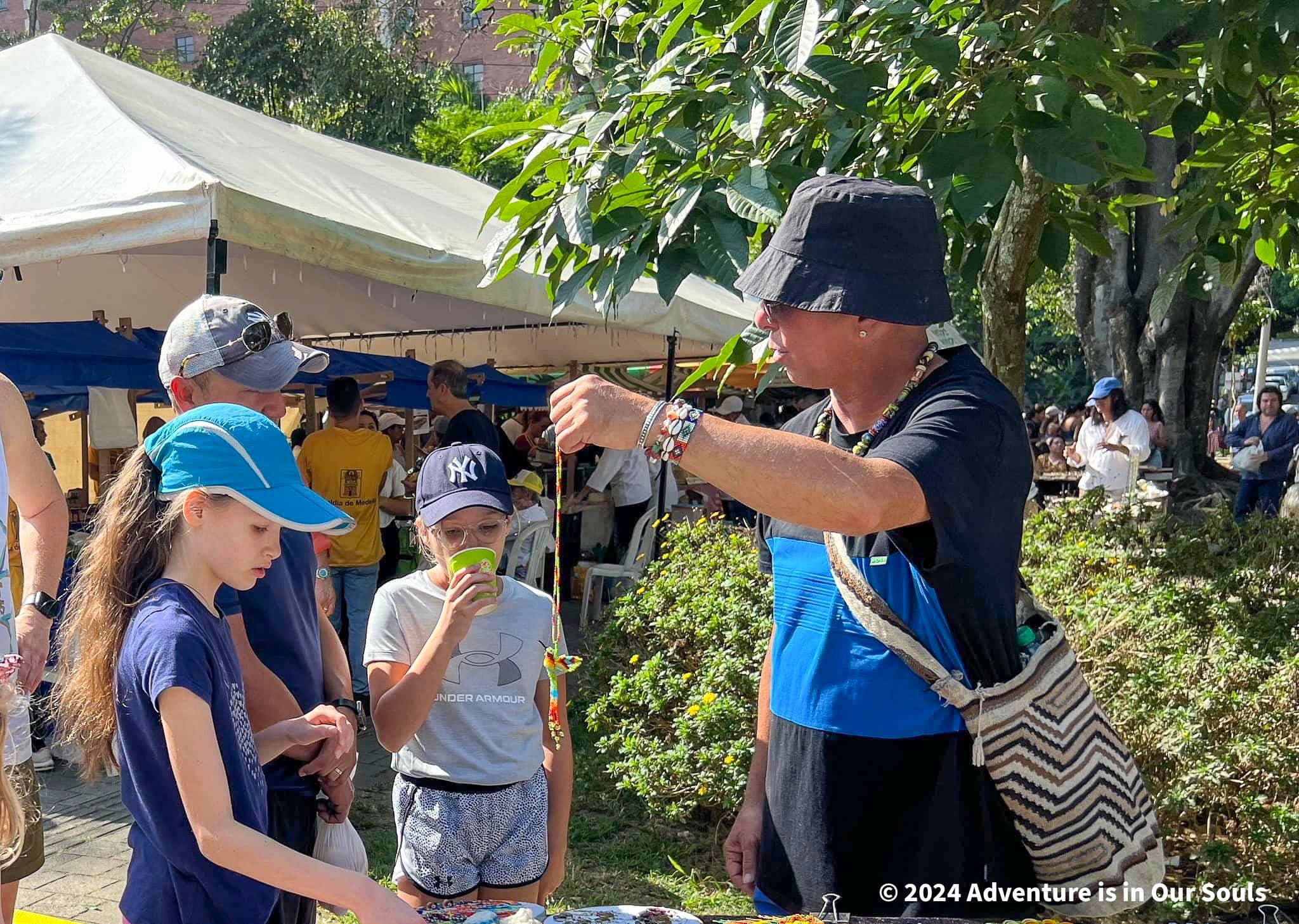 Along the way, we visited local markets brimming with fresh produce, flowers, and street food. Vendors called out their specials while music played in the background. We could not resist sampling the local treats! My favorite was a warm, cheesy arepa. The girls loved aguapanela con limón, a sweet drink made from sugarcane and lemon.
