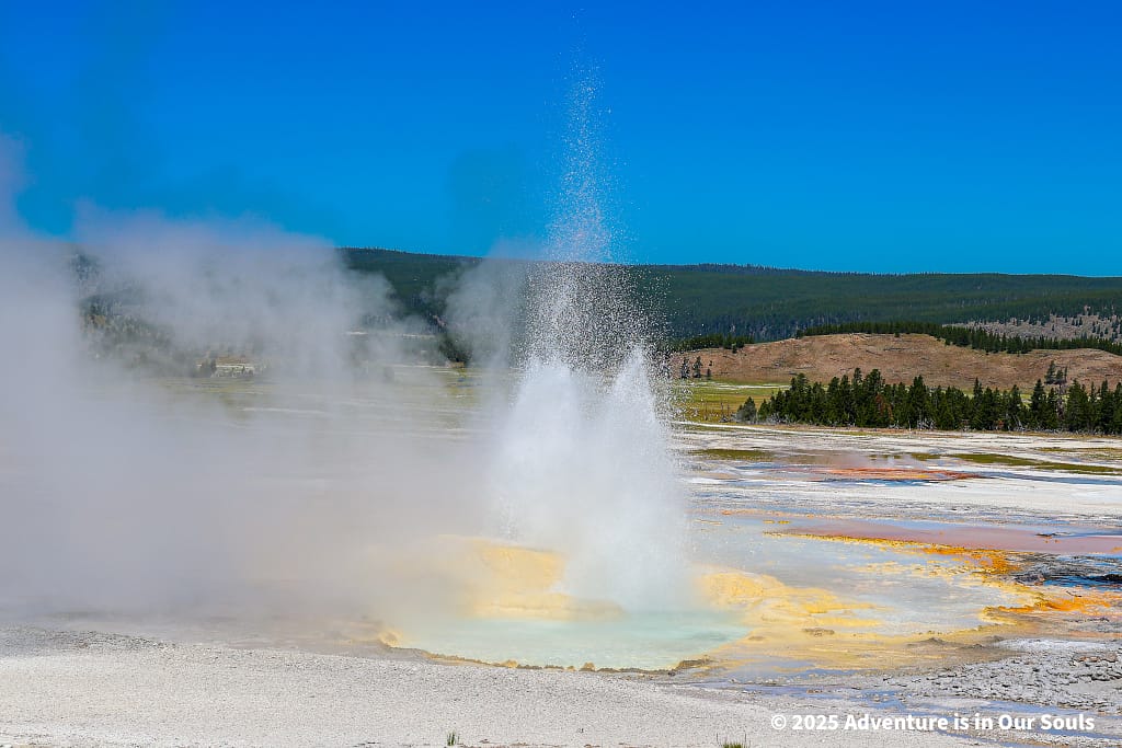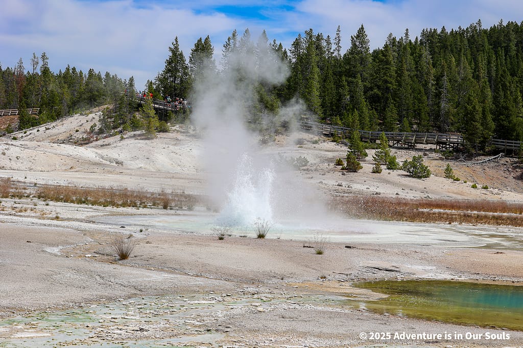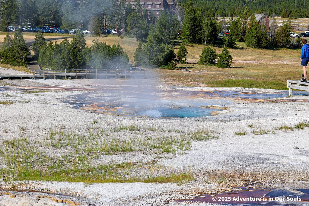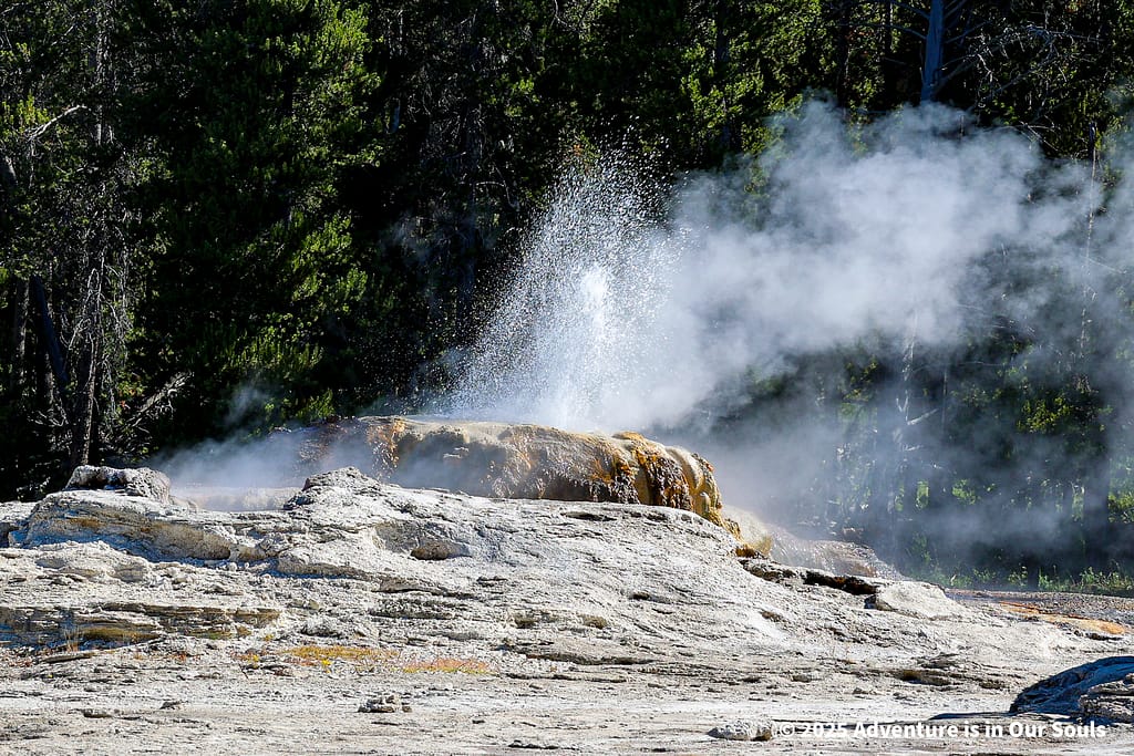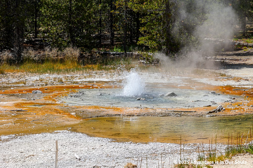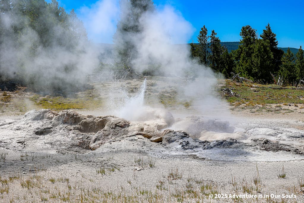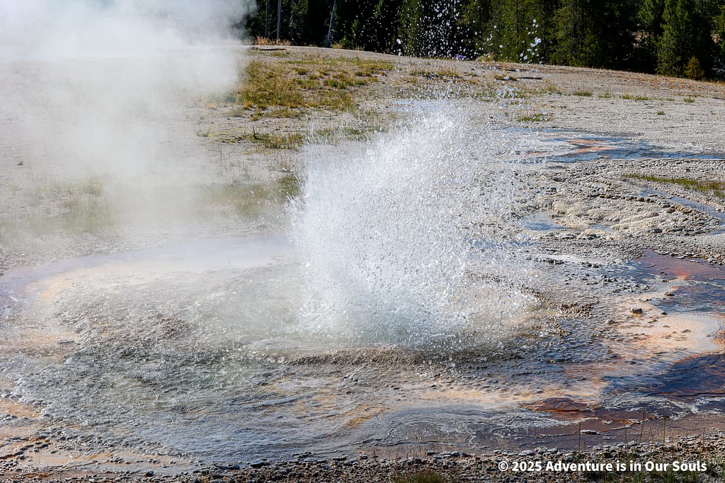 Nearby, Anemone Geyser erupts frequently, roughly every seven to ten minutes. Its twin vents fill and drain in a mesmerizing rhythm, creating a miniature fountain show. The girls loved watching the alternating bursts, fascinated by the way the geyser seemed to “breathe” as it cycled through its natural pattern.