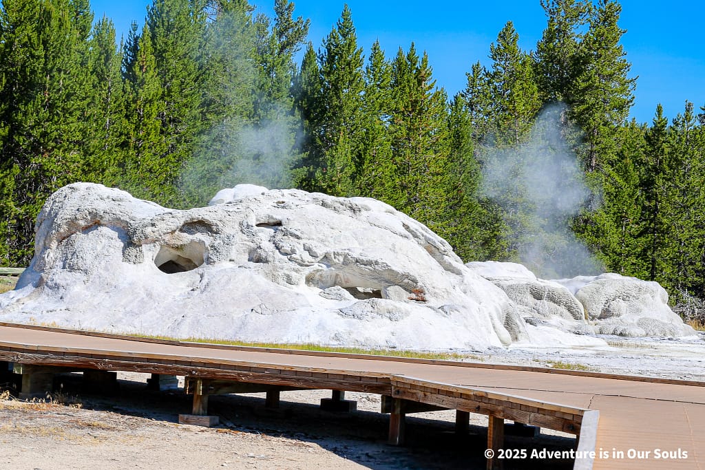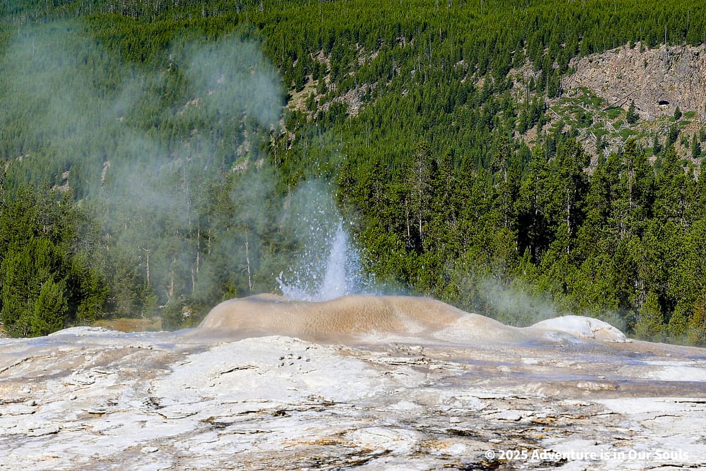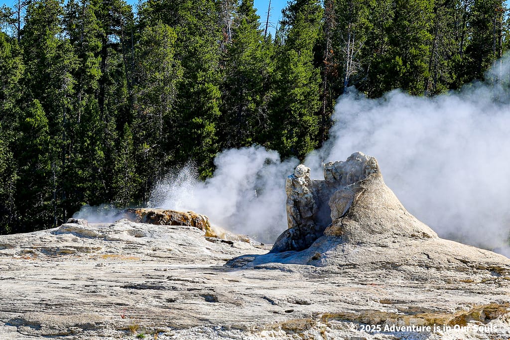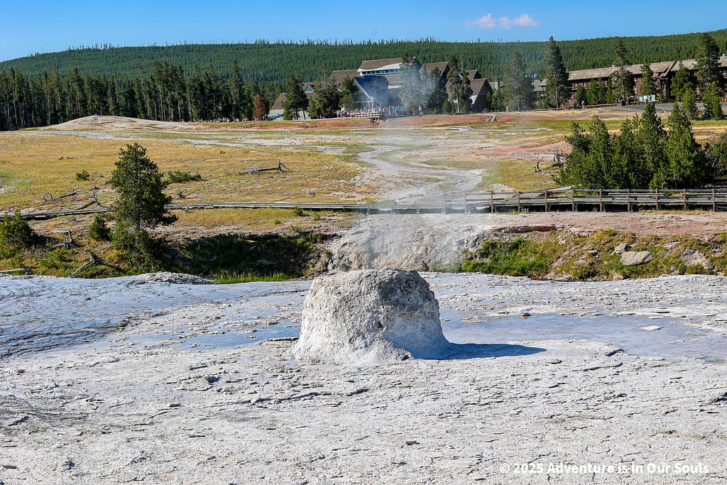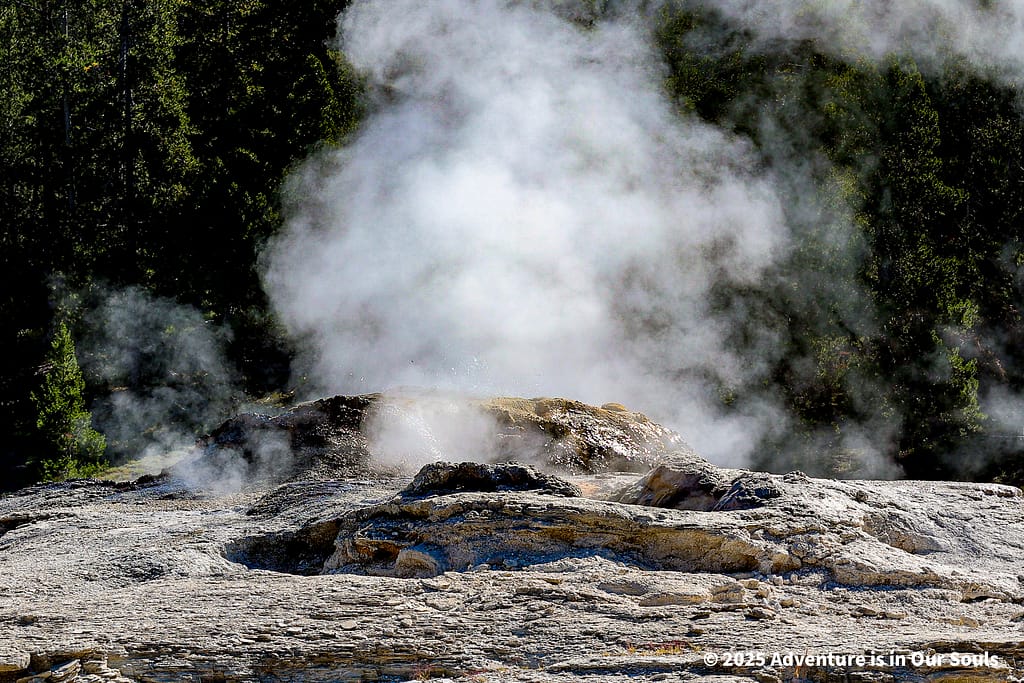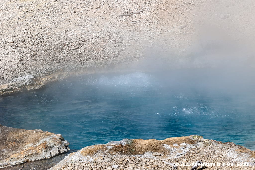 Nearby, Anemone Geyser erupts frequently, roughly every seven to ten minutes. Its twin vents fill and drain in a mesmerizing rhythm, creating a miniature fountain show. The girls loved watching the alternating bursts, fascinated by the way the geyser seemed to “breathe” as it cycled through its natural pattern.