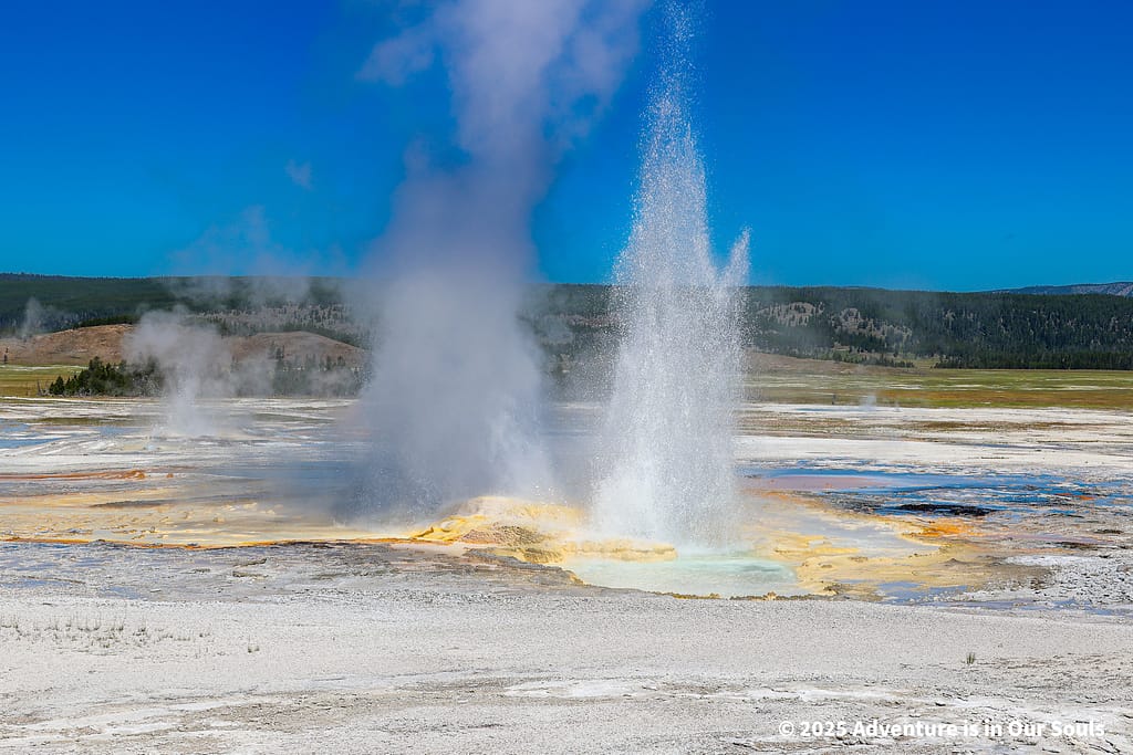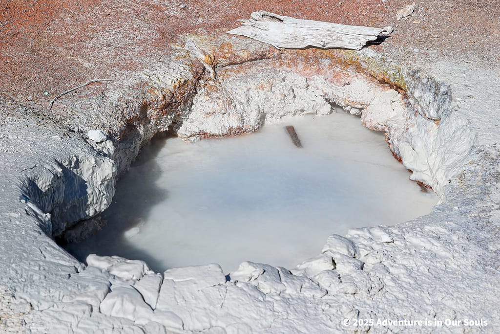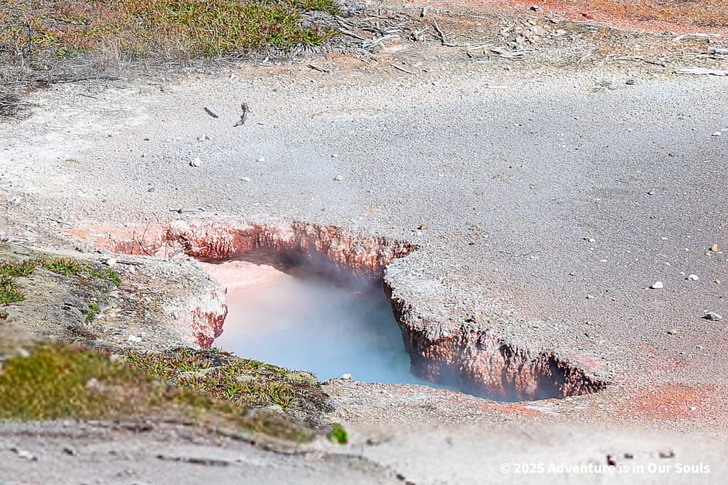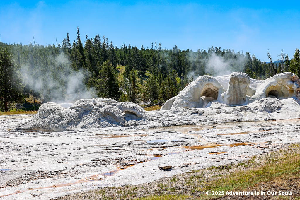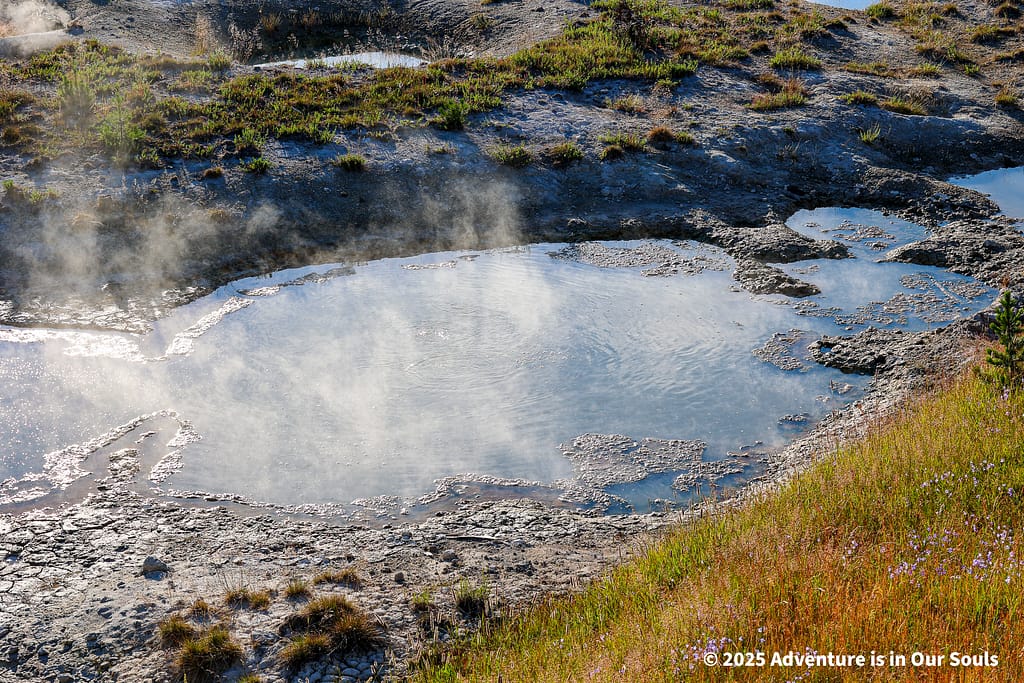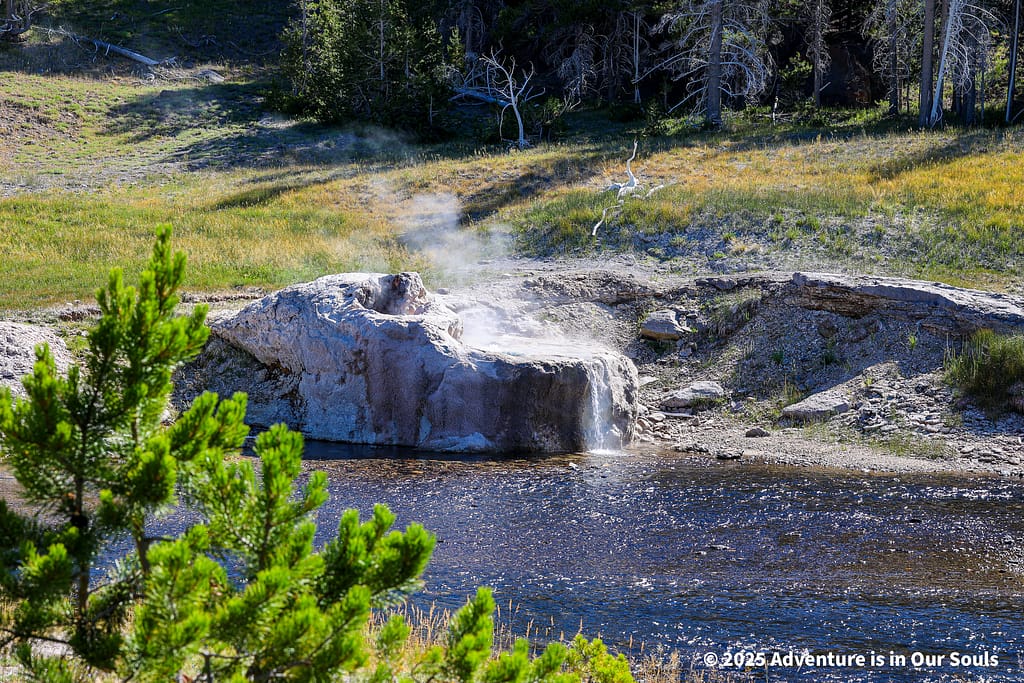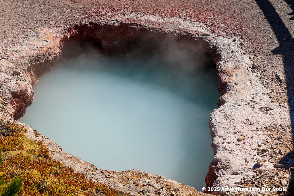 Nearby, Anemone Geyser erupts frequently, roughly every seven to ten minutes. Its twin vents fill and drain in a mesmerizing rhythm, creating a miniature fountain show. The girls loved watching the alternating bursts, fascinated by the way the geyser seemed to “breathe” as it cycled through its natural pattern.