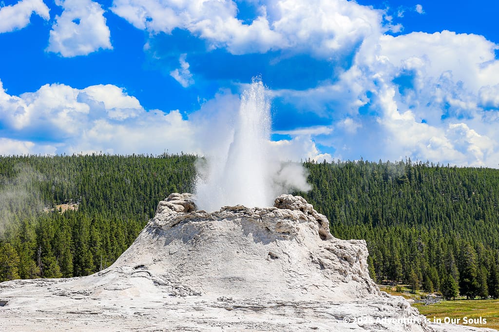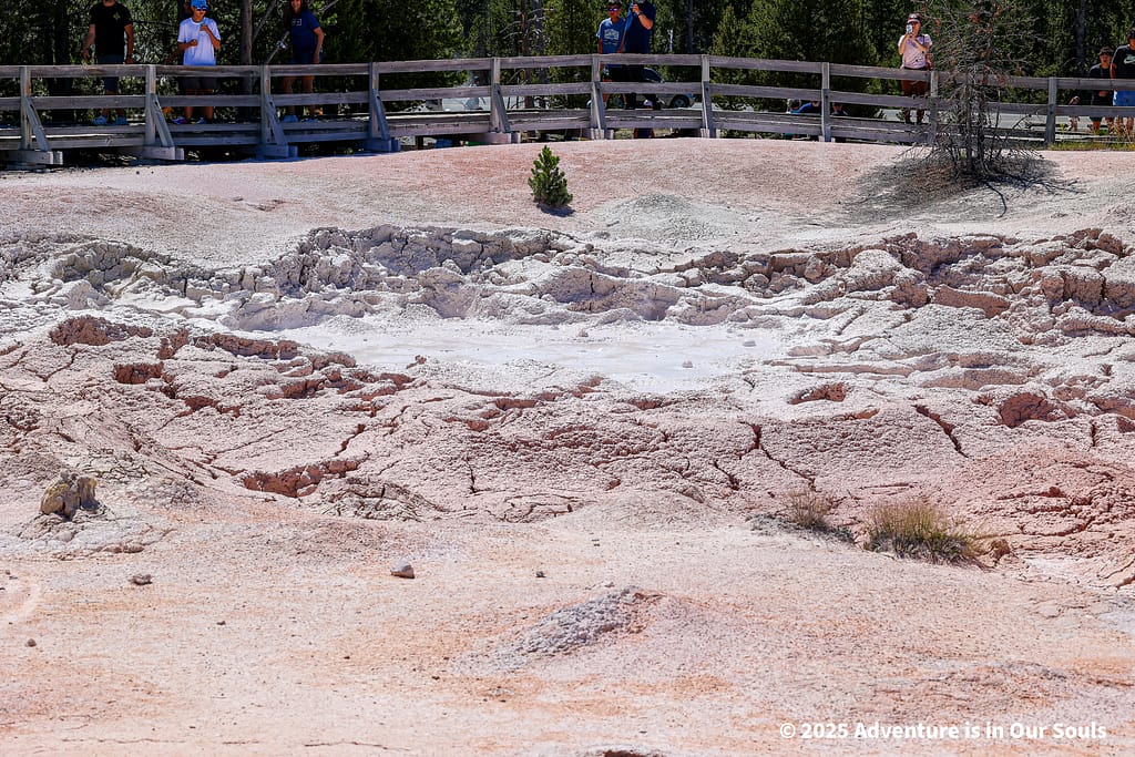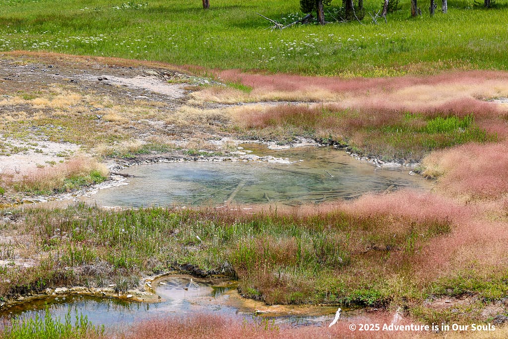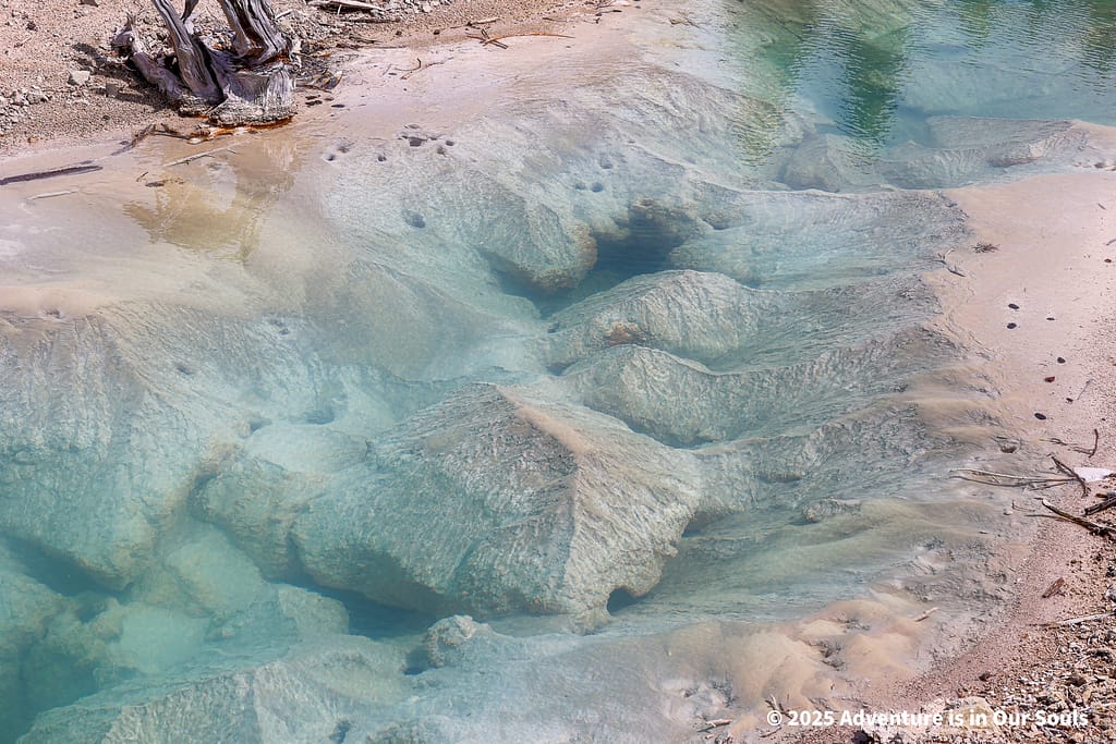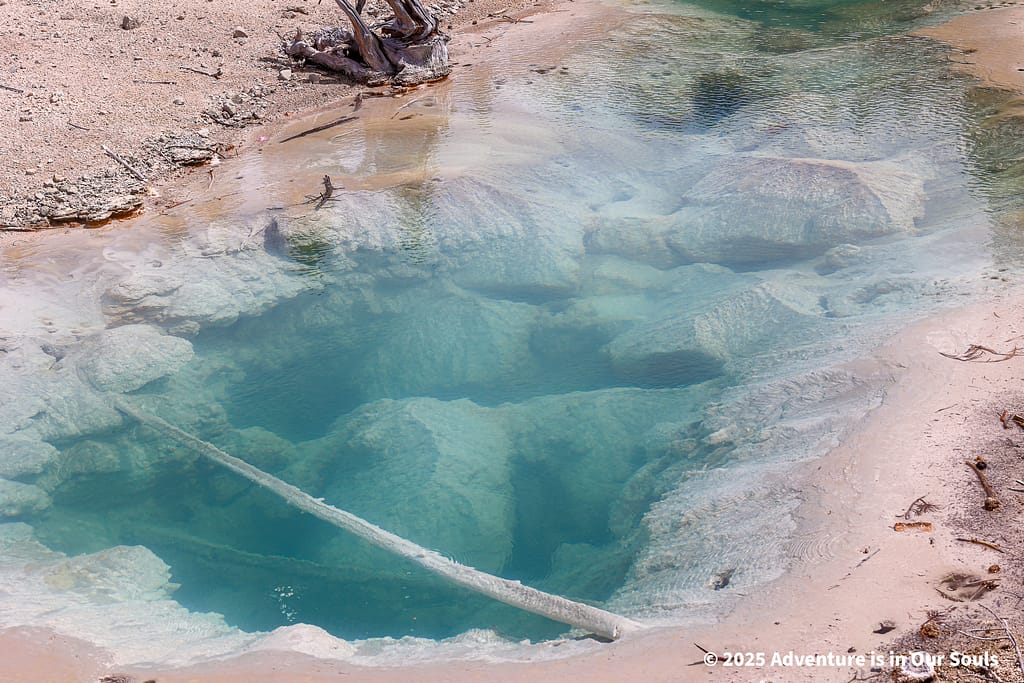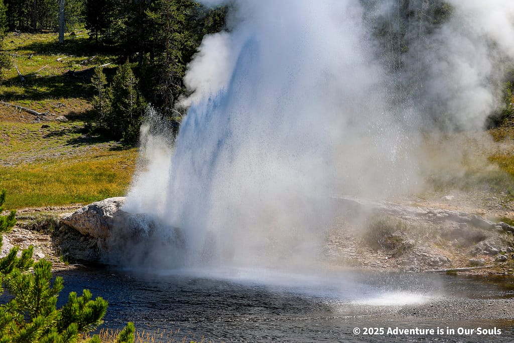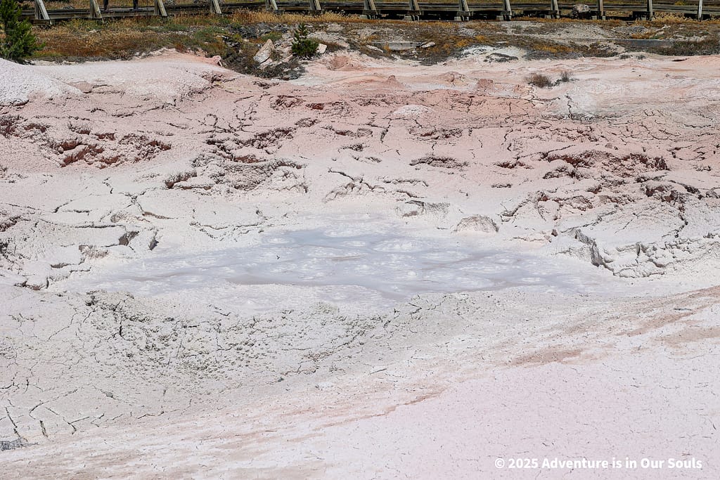 Nearby, Anemone Geyser erupts frequently, roughly every seven to ten minutes. Its twin vents fill and drain in a mesmerizing rhythm, creating a miniature fountain show. The girls loved watching the alternating bursts, fascinated by the way the geyser seemed to “breathe” as it cycled through its natural pattern.