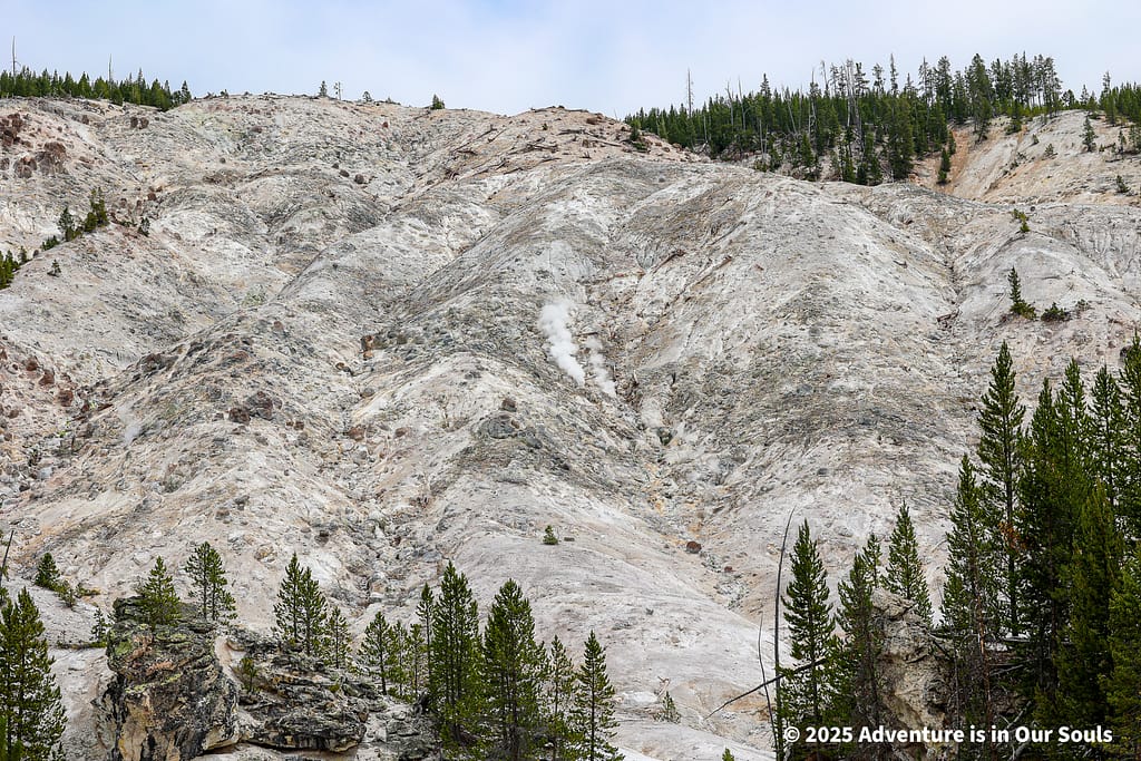 Next, we approached Roaring Mountain, a truly unforgettable stop for families. The mountainside constantly hisses, steams, and releases sulfuric gases, creating a sensory experience that thrills kids and adults alike. Walking along the roadside pullouts, the girls could see the steam rising in wisps and feel the warm heat and occasional scent of sulfur in the air. Early explorers reported that the steam was so intense it could be heard roaring from miles away, giving the mountain its name. Standing here, it was easy to imagine Yellowstone as a living, breathing landscape, where the earth’s energy is visible, audible, and tangible. The combination of sight, sound, and smell makes Roaring Mountain a perfect place to engage children’s curiosity and imagination while learning about the park’s geothermal activity.