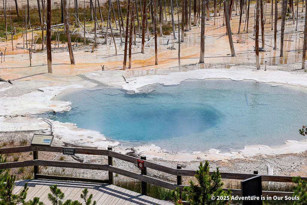Our last stop was Clearwater Springs, a quieter, less crowded area that feels like a hidden gem. Crystal-clear water bubbles up from underground, forming small, gently steaming pools. Mineral deposits line the edges of the springs, catching sunlight and creating subtle color changes in shades of white, yellow, and orange. This is a perfect spot for families to pause, let kids explore safely along boardwalks or rocky edges, and take a moment to enjoy the calming sounds of flowing water. The serene atmosphere provides a peaceful contrast to Yellowstone’s more dramatic geothermal areas, giving families a chance to observe nature at a gentler pace and spot local wildlife such as birds and small mammals that often visit the springs.