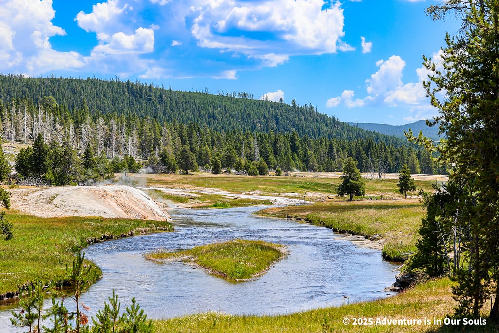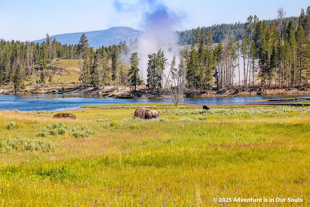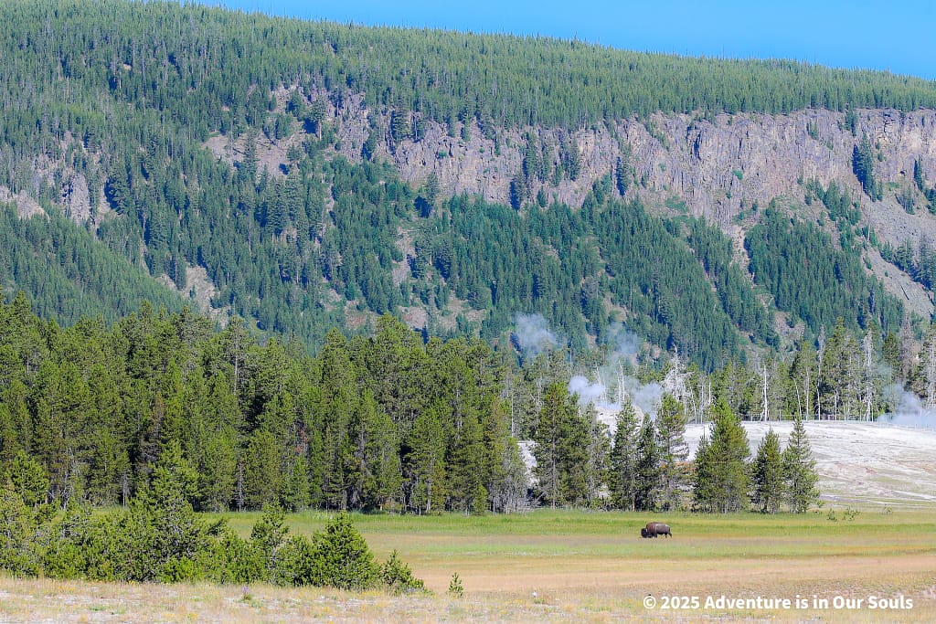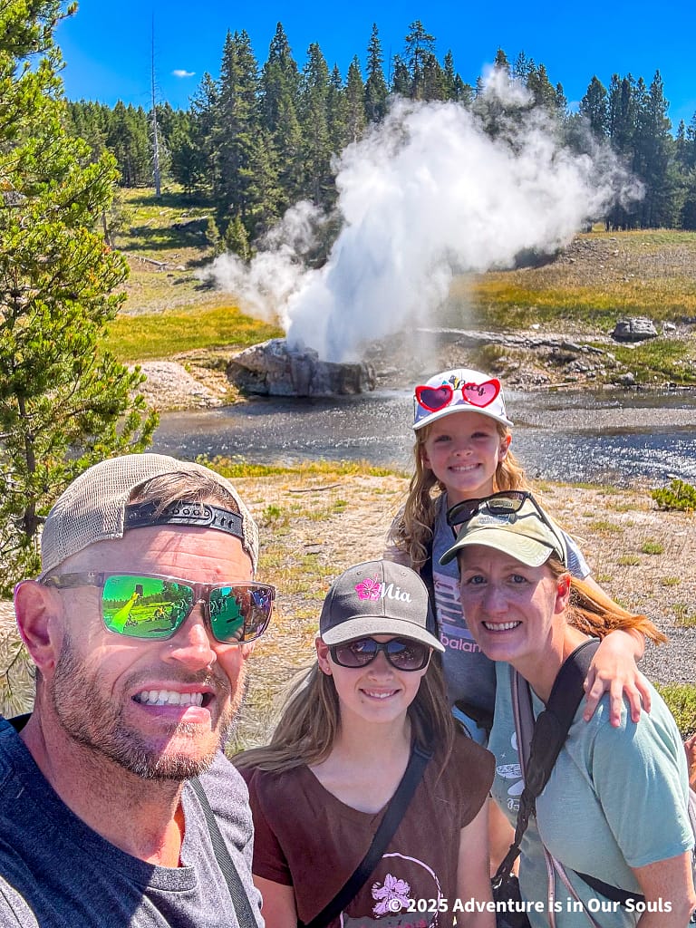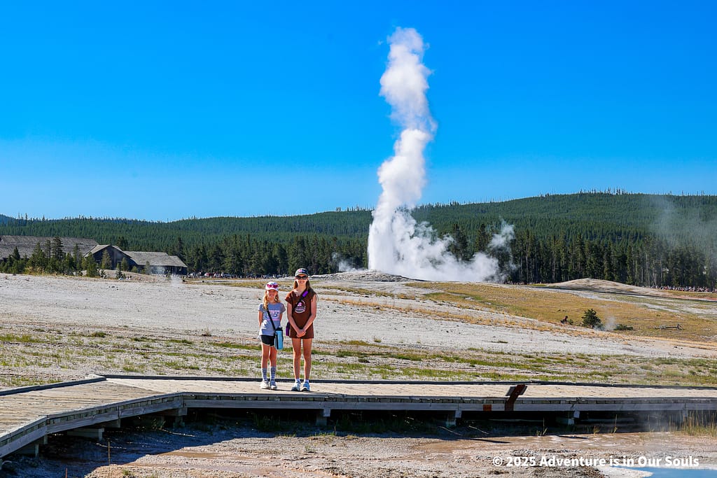 Perched elegantly on the bank of the Firehole River, Riverside Geyser erupts every six to seven hours. The water forms a perfect arch across the river, lasting around 20 minutes. The girls were mesmerized by the way the sunlight caught each droplet mid-air, making it sparkle like liquid diamonds.