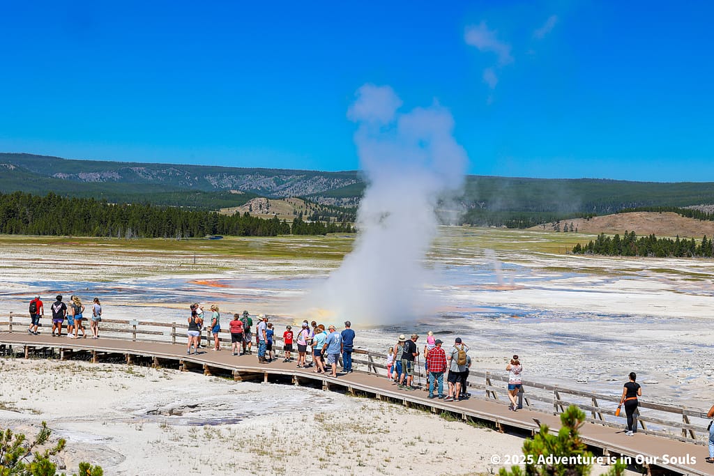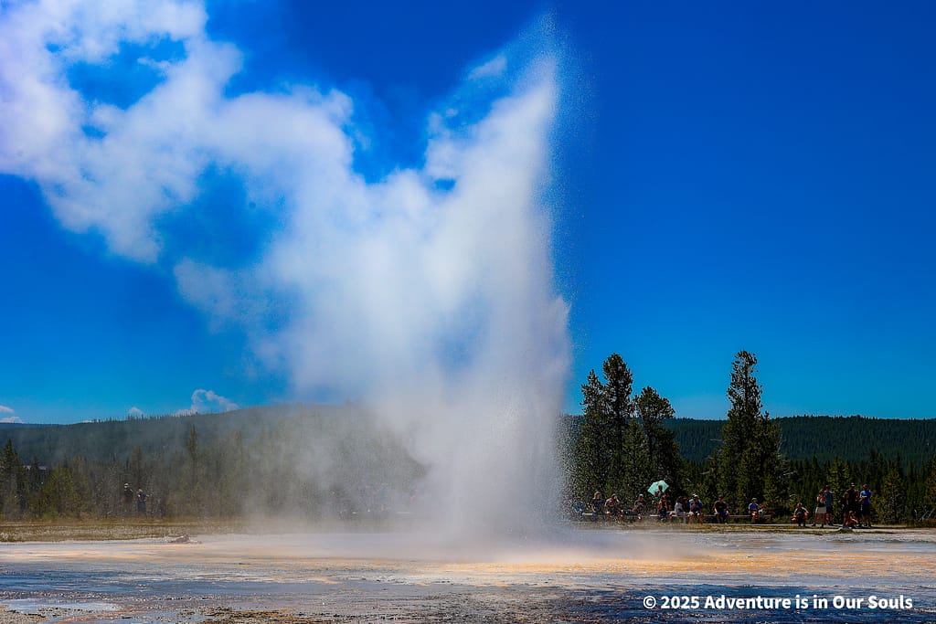 Just a short walk away, Grand Geyser lives up to its name. It is the tallest predictable geyser in the world, reaching heights of 200 feet during multi-phase eruptions that can last up to 12 minutes. Standing nearby, we could feel the spray on our faces and hear the steady roar as water shot skyward. The combination of size, rhythm, and steam makes it feel like the geyser is performing its own natural symphony, a performance that captivates adults and children alike.