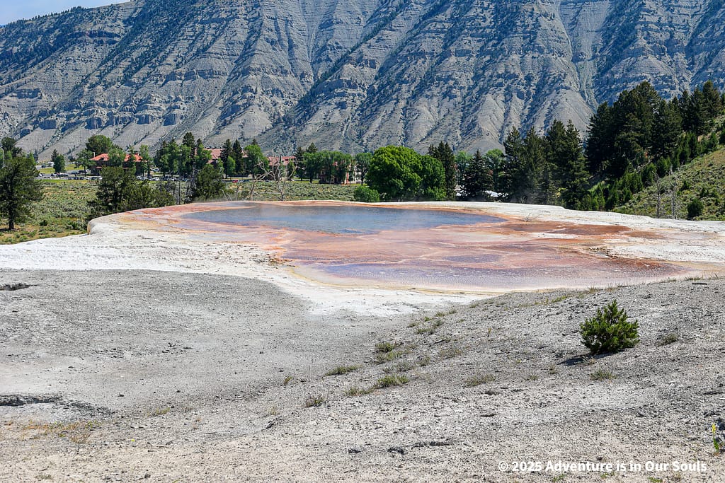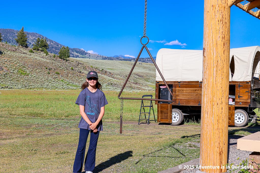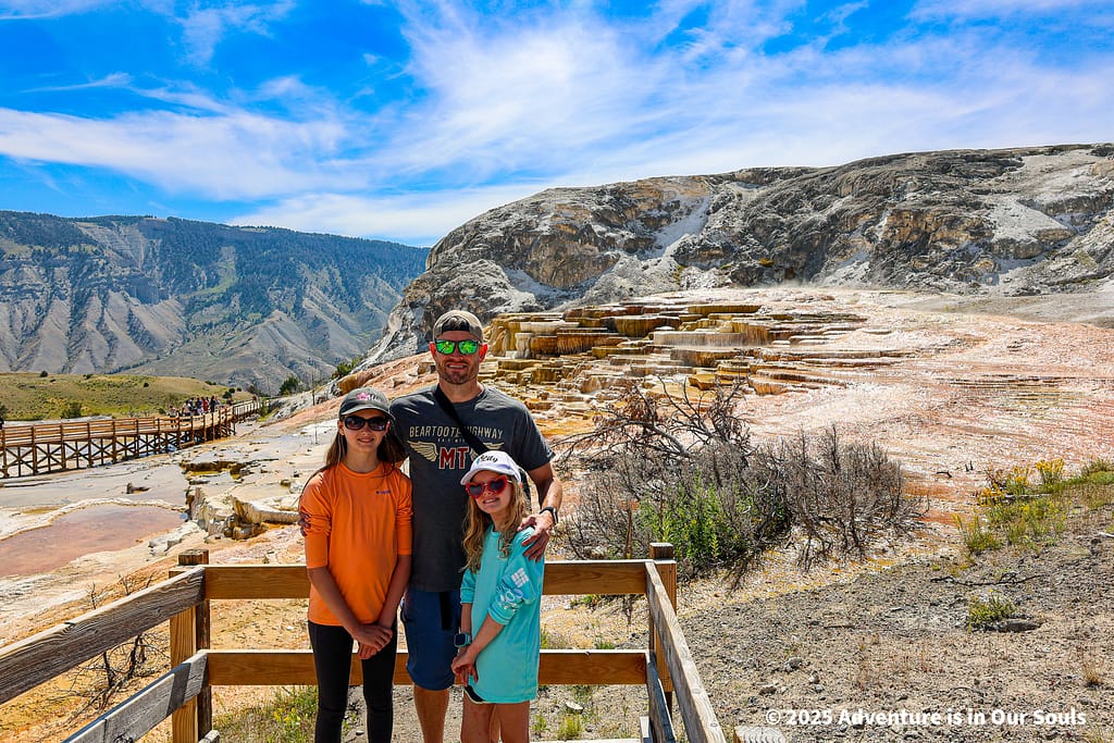 After our stagecoach adventure and wildlife watching, we headed west to Mammoth Hot Springs, where we spent the next two nights of our Yellowstone journey. Mammoth is a fascinating area located near Yellowstone’s north entrance, close to historic Fort Yellowstone and the Mammoth Hot Springs Historic District. The landscape here combines geothermal wonders with rolling sagebrush fields and abundant wildlife, making it a perfect base for families who want both adventure and convenience.