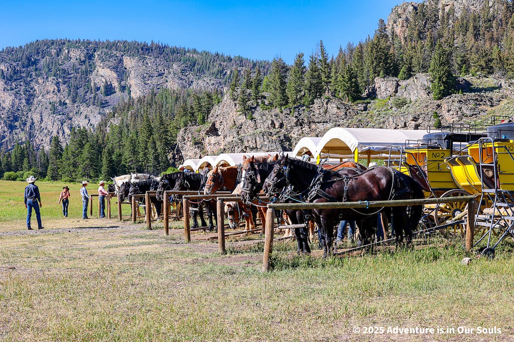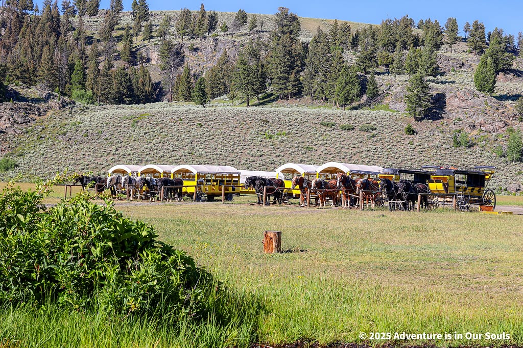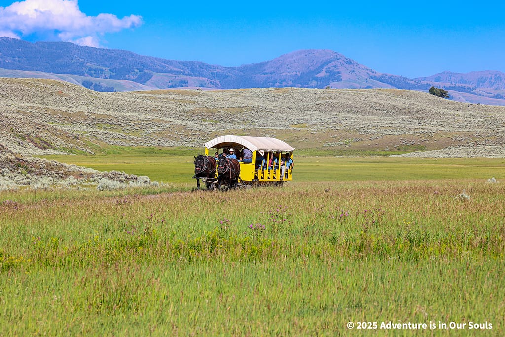 One of the highlights of our Yellowstone trip was the stagecoach wagon ride to the Old West Cookout, starting at the Roosevelt Lodge stables. We climbed aboard a historically accurate reproduction stagecoach, complete with wooden benches and leather straps. The ride carried us through the golden sagebrush flats of Pleasant Valley toward Yancy’s Hole, a wide valley framed by scattered pines and distant ridges that gave the journey a genuine frontier feel.