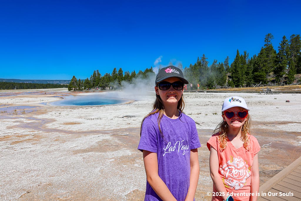 Walking along the boardwalks, the girls could see mud bubbling and occasionally splattering, creating natural artwork that shifted throughout the day. Hot springs emitted steam in gentle wisps, while tiny geysers shot water sporadically, surprising and delighting young explorers. The combination of movement, color, and sound made this area feel like a living canvas, and it was easy to imagine the geological forces at work beneath our feet. Families can linger here safely, letting kids take in the sights, sounds, and textures while learning how Yellowstone’s volcanic activity shapes the landscape.