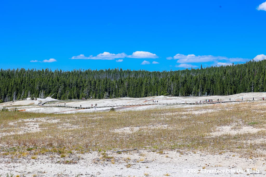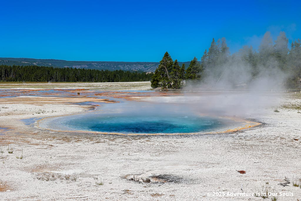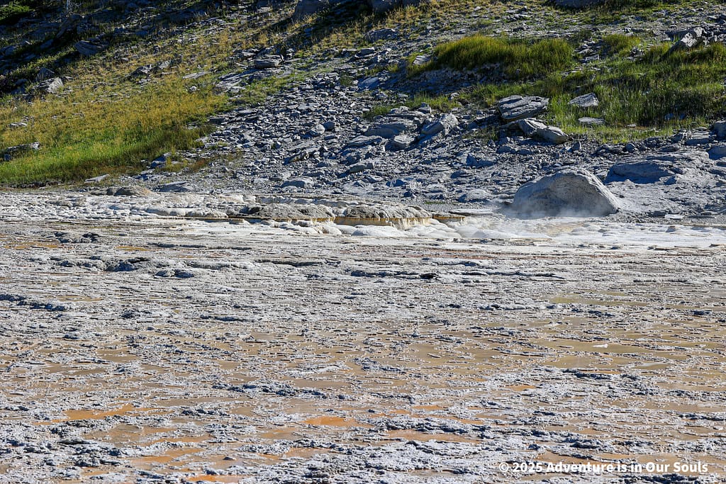 Our walk began at Sulphide Spring, a small but incredibly hot spring. Its high sulfur content gives the air a distinct mineral scent, a signature smell of Yellowstone’s geothermal activity. The surface bubbles quietly, hinting at the intense heat just below. This spring is a reminder of the unseen power simmering beneath the park.
