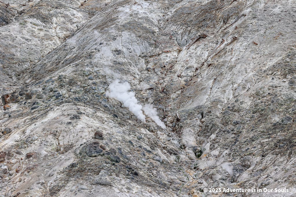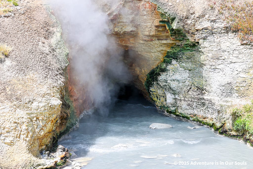 One of the highlights along the trail was Dragon’s Mouth Spring, a feature that releases steam from a deep cave where hot water surges against the cavern walls. Early visitors imagined the rumbling sounds came from a mythical creature inside the earth, giving the spring its evocative name. Even from a distance, the steam rising against the rocky hillside creates a dramatic and almost magical scene. The girls were thrilled by the sound and movement, imagining dragons lurking beneath the earth while learning about the geological forces creating this spectacular display.