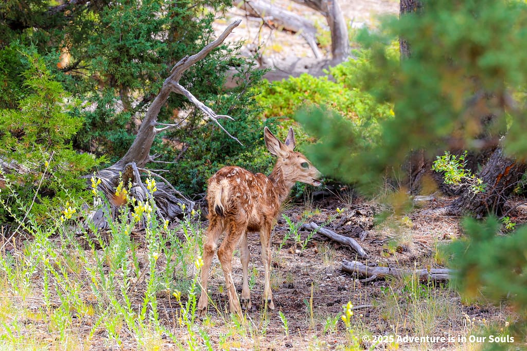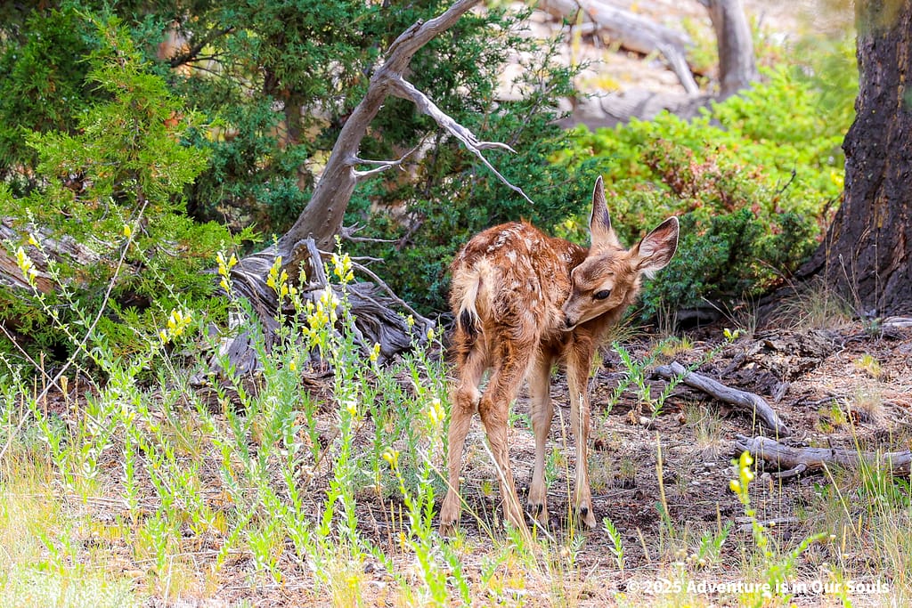 A black-tailed deer fawn resting nearby added an unforgettable wildlife highlight, showing that Yellowstone’s beauty isn’t just in the geology, it’s also in its living inhabitants.