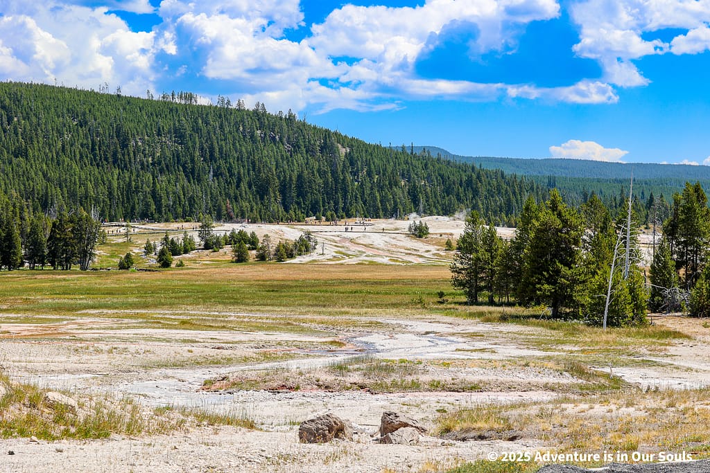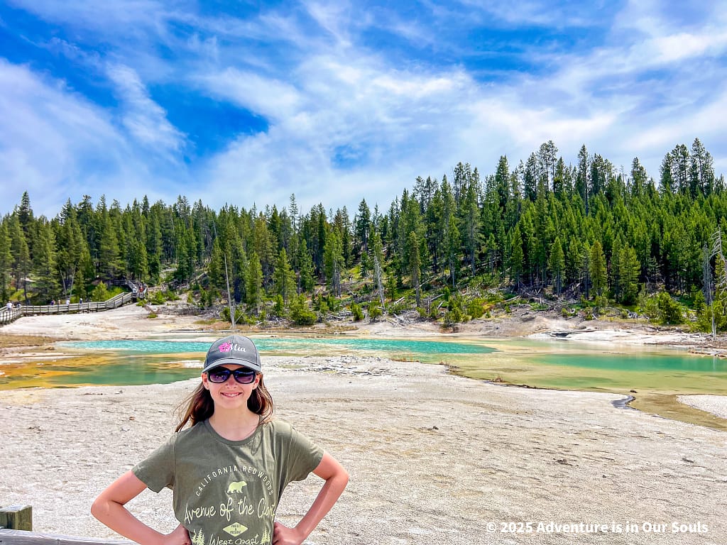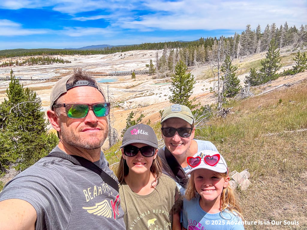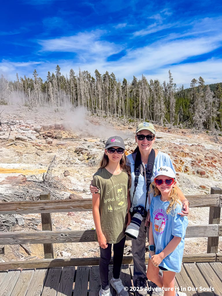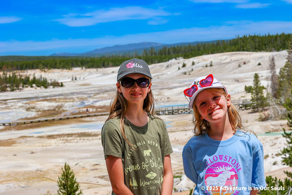 Our first stop in the Norris Region was the Porcelain Basin, named for its shimmering, milky-white mineral deposits that cover the ground like a layer of snow. Walking along the boardwalks, the girls were fascinated by the constantly changing shapes and colors of the terrain. Steam drifted lazily from fumaroles, and the strong sulfur scent added to the feeling of stepping onto another planet.