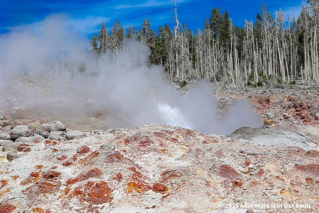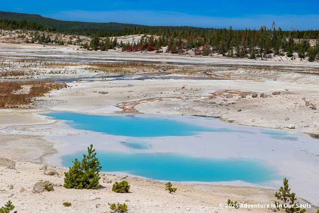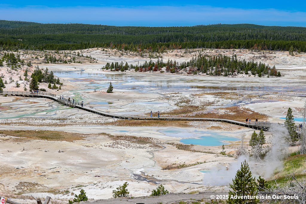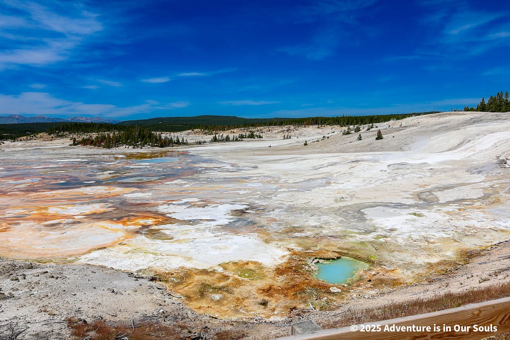 From the Porcelain Basin, we continued to the Norris Upper Geyser Basin, a more forested and secluded area with winding boardwalks that offer shady relief from the sun. The basin feels calmer but just as magical, with colorful pools and powerful geysers hidden among the lodgepole pines.