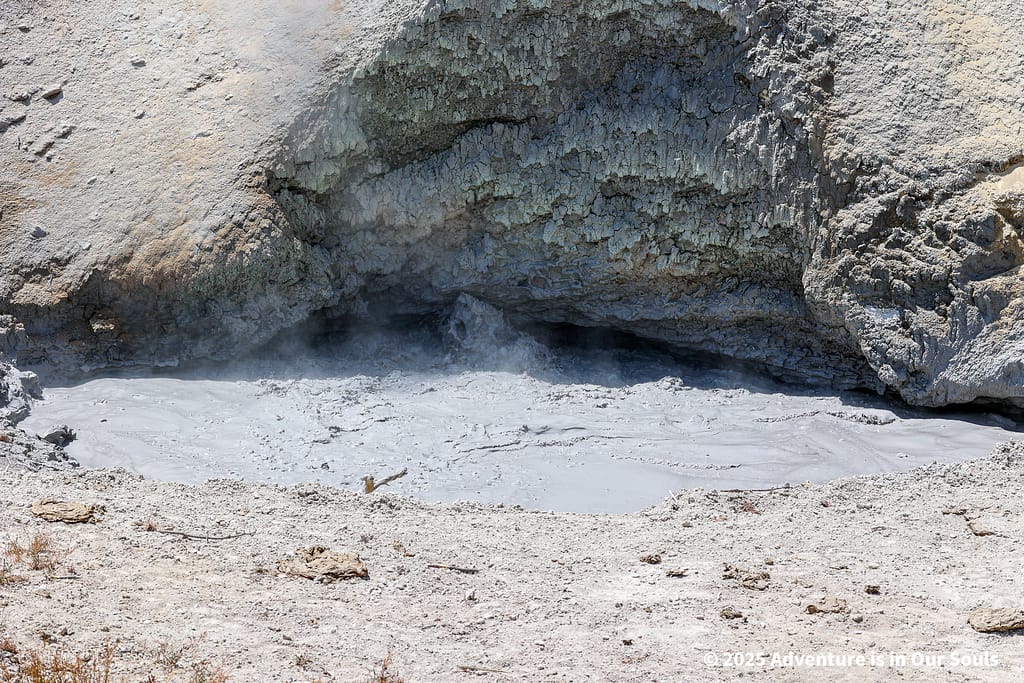 After lunch, we returned to the Grand Loop and stopped at the Mud Volcano Trail, an area that early explorers in the 1870s described as violently erupting with mud and steam. The entire hillside is heated by the massive volcanic system beneath Yellowstone, and walking through this area is a vivid reminder of the park’s active geothermal heart.