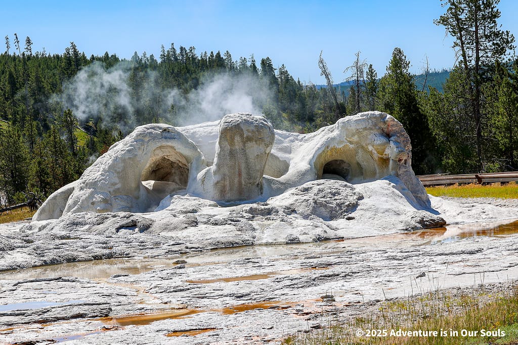 Rocket Geyser erupts in short, powerful bursts that can reach up to 40 feet. Often connected to Grotto Geyser, its activity demonstrates the underground networks that link multiple geysers together, a fascinating reminder of Yellowstone’s complex hydrothermal system. Grotto Geyser entertains visitors with long eruptions that send water through natural arches, creating shapes that seem almost sculpted for the imagination. The girls loved guessing what the water patterns might resemble, turning science into play.