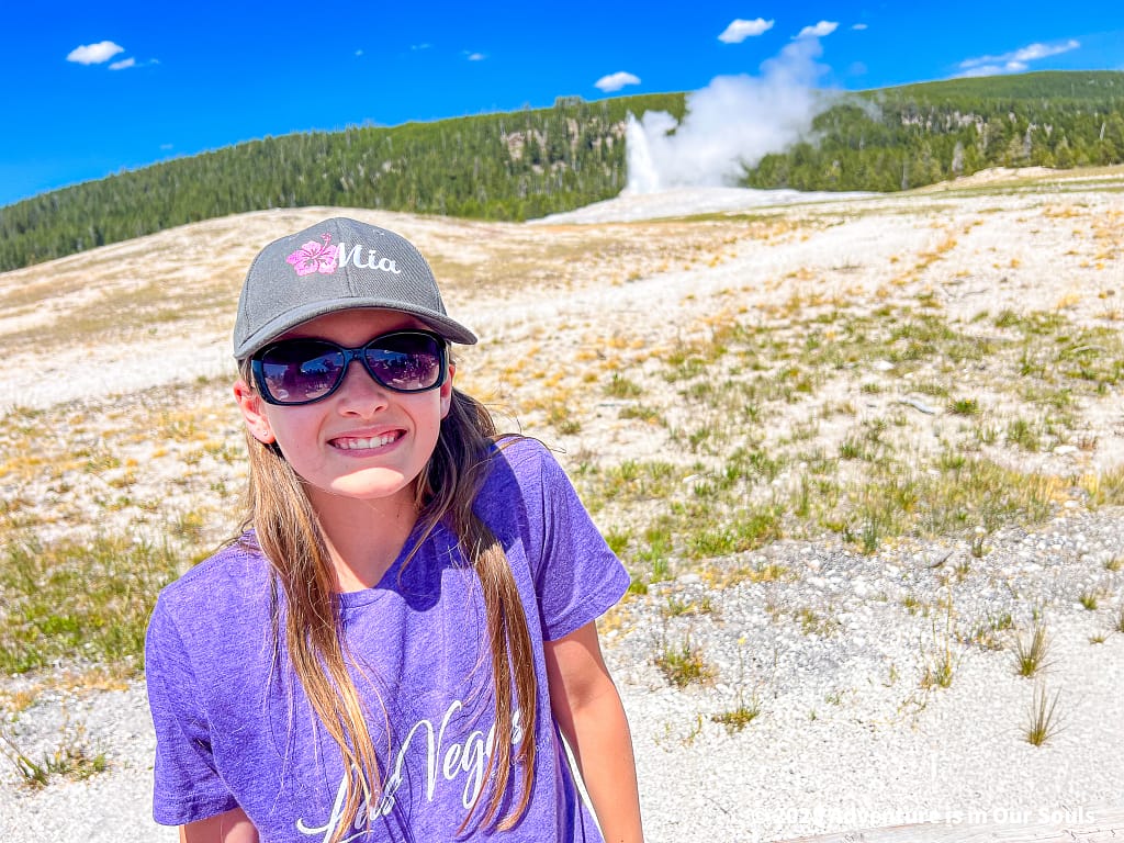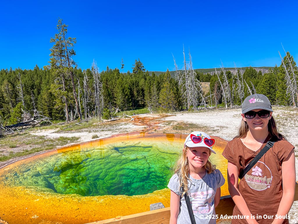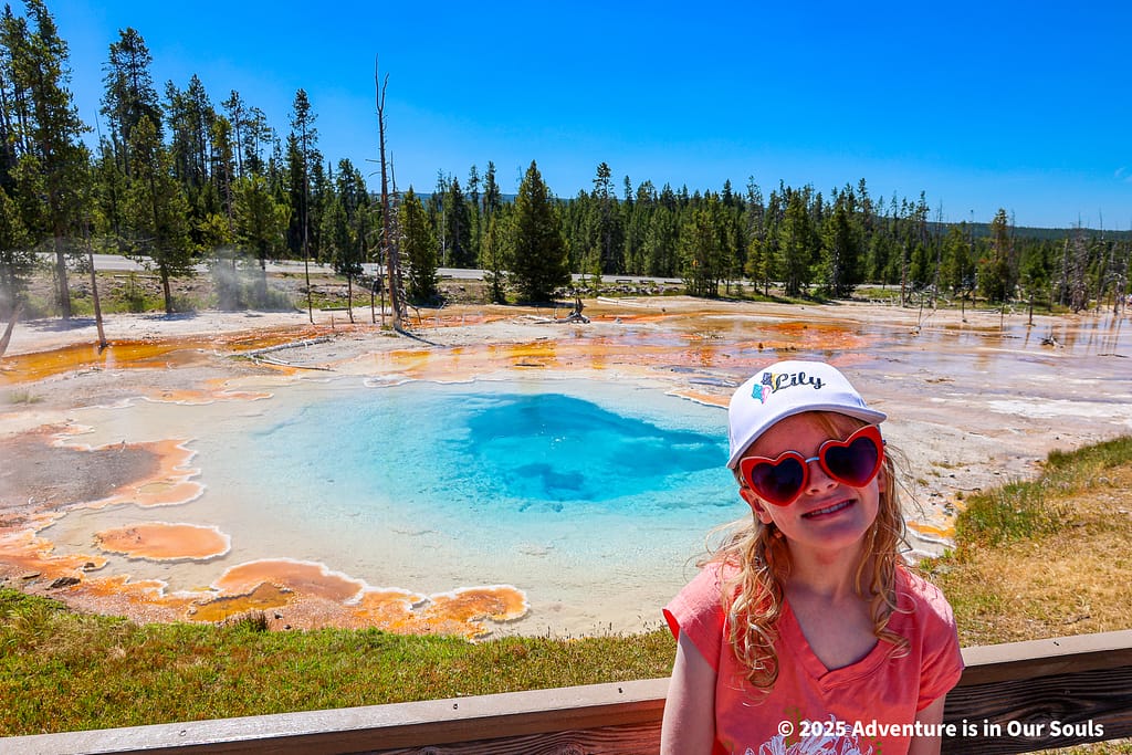 Morning Glory Pool is one of the basin’s most iconic features. Its deep blue center surrounded by green and gold rings is caused by heat-loving bacteria called thermophiles, which thrive in different temperature zones around the pool. The vibrant colors make it feel almost like a painter’s palette come to life. The girls were enchanted by the way the colors changed depending on the angle of the sun and the shadows around the pool, sparking endless questions about how life can survive in such extreme conditions.