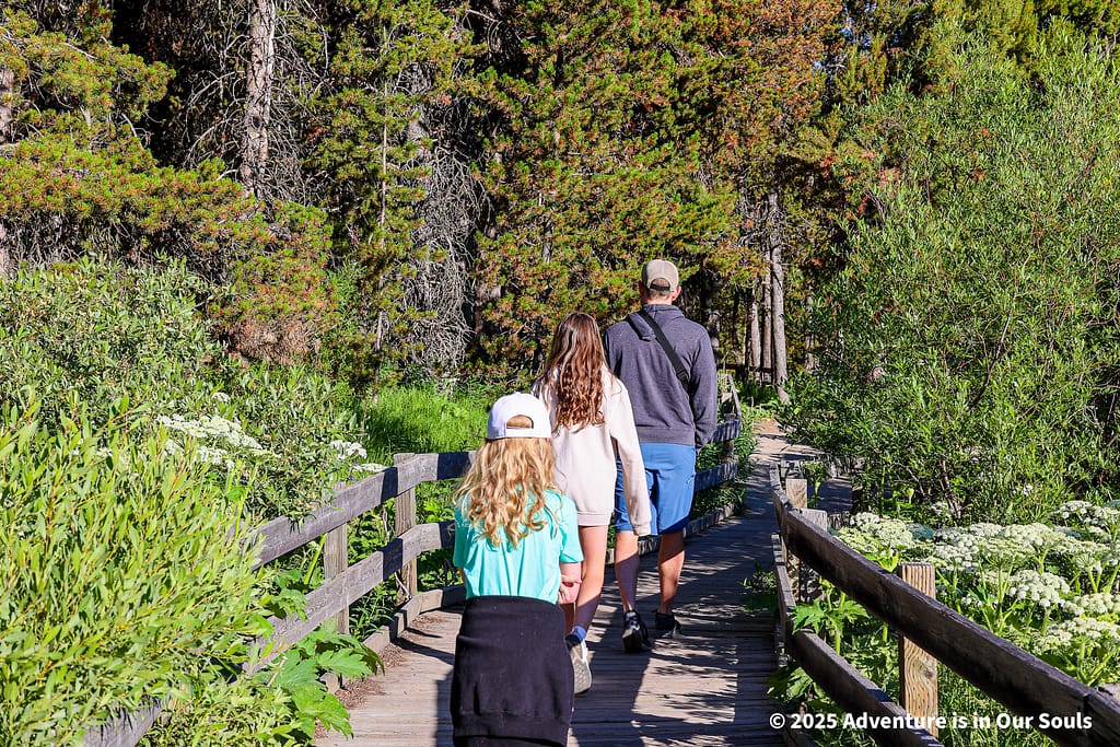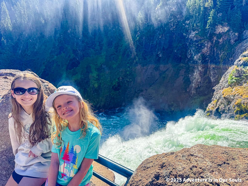 We stopped at Fisherman’s Bridge, a historic site once famous for trout fishing before restrictions were introduced to protect the native cutthroat trout population. From the bridge, the girls loved watching the water rush over volcanic rock ledges, imagining what it would be like to fish here long ago.