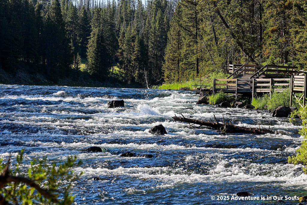 Next, we stopped at Lehardy Rapids along the Yellowstone River. The rapids form as the river drops over volcanic rock ledges, creating a lively flow of water. The area is known for trout migrations in early summer, so we had our hopes up for spotting wildlife. We watched the rushing water, imagining bears darting along the banks, but today the rapids were peaceful and undisturbed.