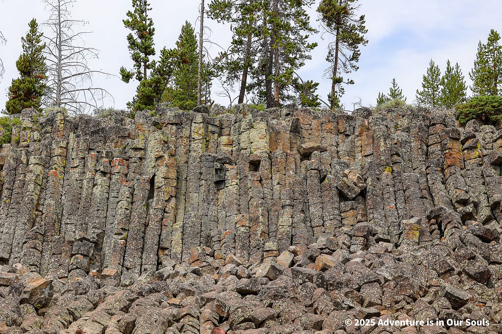 A short drive from Golden Gate brought us to Sheepeater Cliff, an impressive wall of columnar basalt. The cliff was formed when ancient lava flows cooled and cracked into tall, geometric pillars, creating natural patterns that look almost sculpted. The site is named after the Tukudika, or “Sheepeater” band of the Shoshone people, who once hunted bighorn sheep in this region. Walking along the pullouts here gives families a tangible connection to both the park’s volcanic history and the rich cultural heritage of Yellowstone’s earliest inhabitants. The girls were fascinated by the towering columns, imagining the ancient stories that might have unfolded along these cliffs.