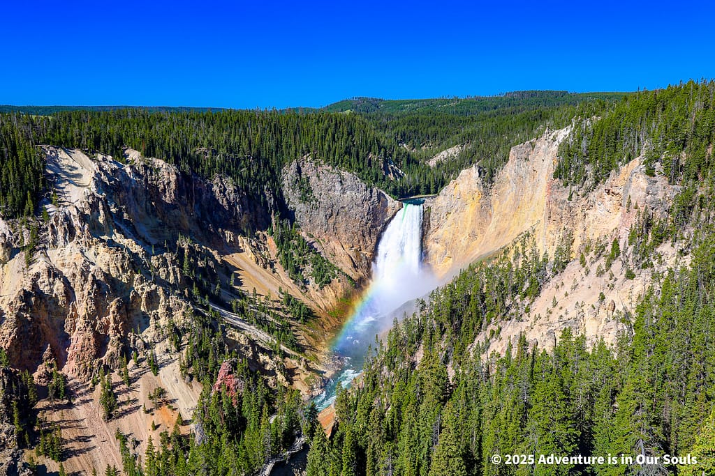 A short drive brought us to Artist Point, perhaps the most famous view in Yellowstone. From here, the Lower Falls drop 308 feet, framed by canyon walls streaked with brilliant reds, oranges, and yellows created by hydrothermal alteration over thousands of years. The combination of sheer height, rushing water, and striking colors made it a scene that felt straight out of a painting. The girls were captivated, counting the rainbow mist in the spray and imagining they were explorers witnessing this natural masterpiece for the first time.