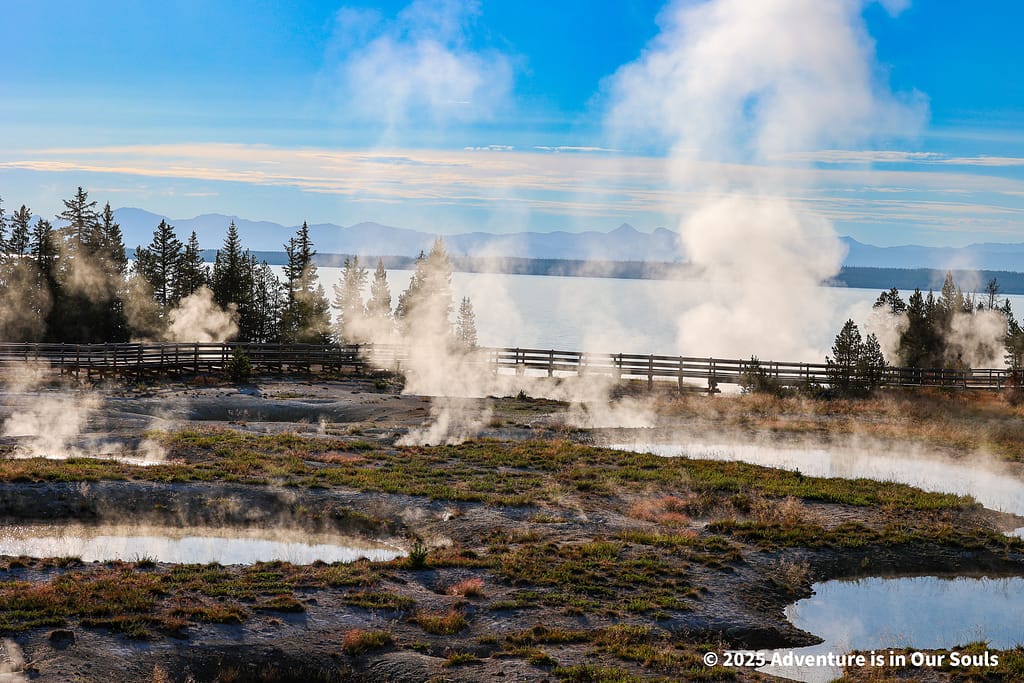West Thumb feels different from other geothermal areas in Yellowstone. The combination of steaming hot springs against the backdrop of the massive, serene lake creates a surreal, almost otherworldly atmosphere. From the parking area, we could see plumes of steam rising in the early morning sun, reflecting in the calm blue waters of the lake. The mineral-rich pools here bubble and hiss constantly, releasing heat and gases from the still-active volcanic system beneath the lake’s surface.