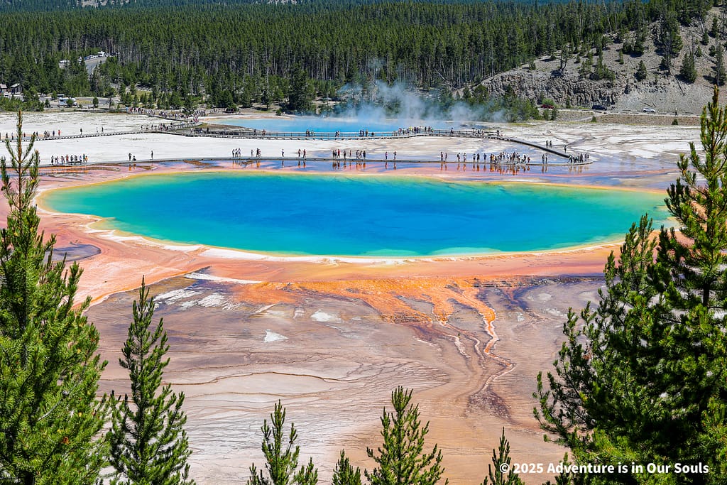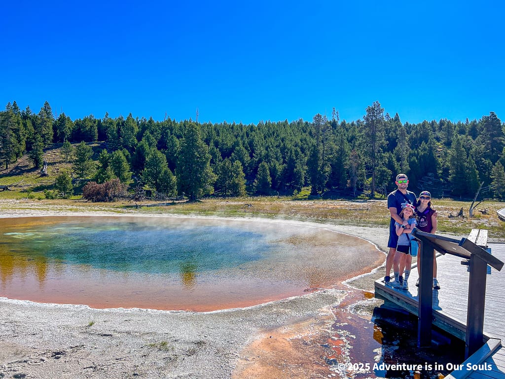 Even from above, the area offers opportunities for families to connect with Yellowstone’s wildlife. Birds can often be seen near the spring, and small mammals occasionally explore the edges of the overlook, providing glimpses into how life thrives alongside these geothermal features. Observing the spring from a distance allowed us to fully appreciate its size and beauty while avoiding the crowds below. Grand Prismatic Spring offers a multi-sensory experience with its dazzling colors, rising steam, and the surrounding forest, leaving visitors of all ages in awe of Yellowstone’s geothermal magic.