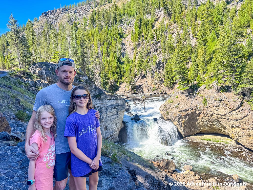 A short drive farther south brought us to Firehole Falls, tucked within the narrower Firehole Canyon. The 40-foot cascade is framed by volcanic cliffs, and the water moves swiftly through the gorge, reflecting steam vents nearby. Named for the geothermal heat that warms sections of the river, Firehole Falls offers a dramatic contrast to the pastel colors of the paint pots, showing how Yellowstone’s volcanic history shapes both its rivers and waterfalls. Kids loved spotting the mini rapids and imagining the water rushing through the canyon thousands of years ago.