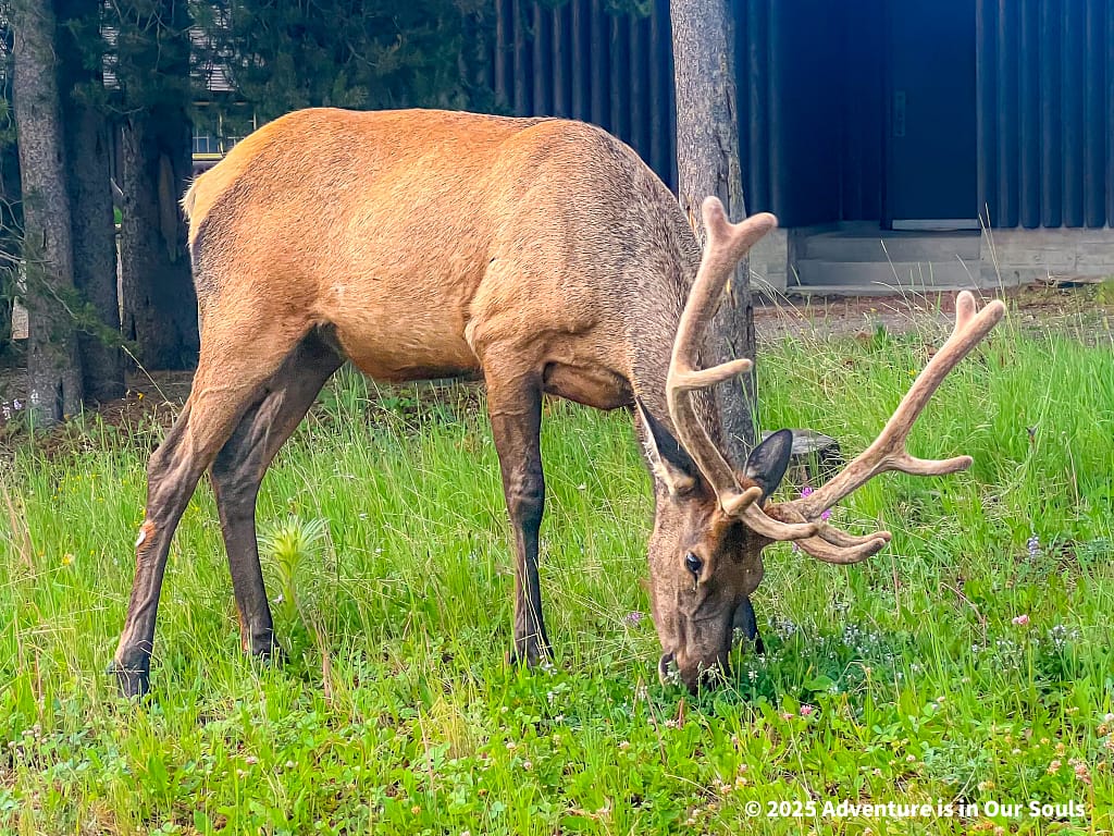 We stayed at the Mammoth Hot Springs Hotel & Cabins, a classic in‑park lodging that has welcomed visitors since the early 1900s and was beautifully renovated while keeping its historic charm. The hotel sits just below the travertine terraces that make this area so unique, and it’s common to spot elk grazing outside the dining room or near the lawn in the early morning and evening.