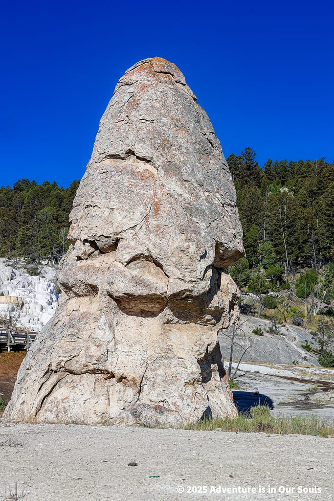 The Lower Terraces are the first areas families usually encounter, offering a mix of dramatic formations and accessible boardwalks. Liberty Cap stands proudly at 37 feet high, formed over thousands of years. Its cone shape gives a clear view of how geothermal activity builds mineral features over time, making it perfect for family photos and a striking introduction to Yellowstone’s natural power.